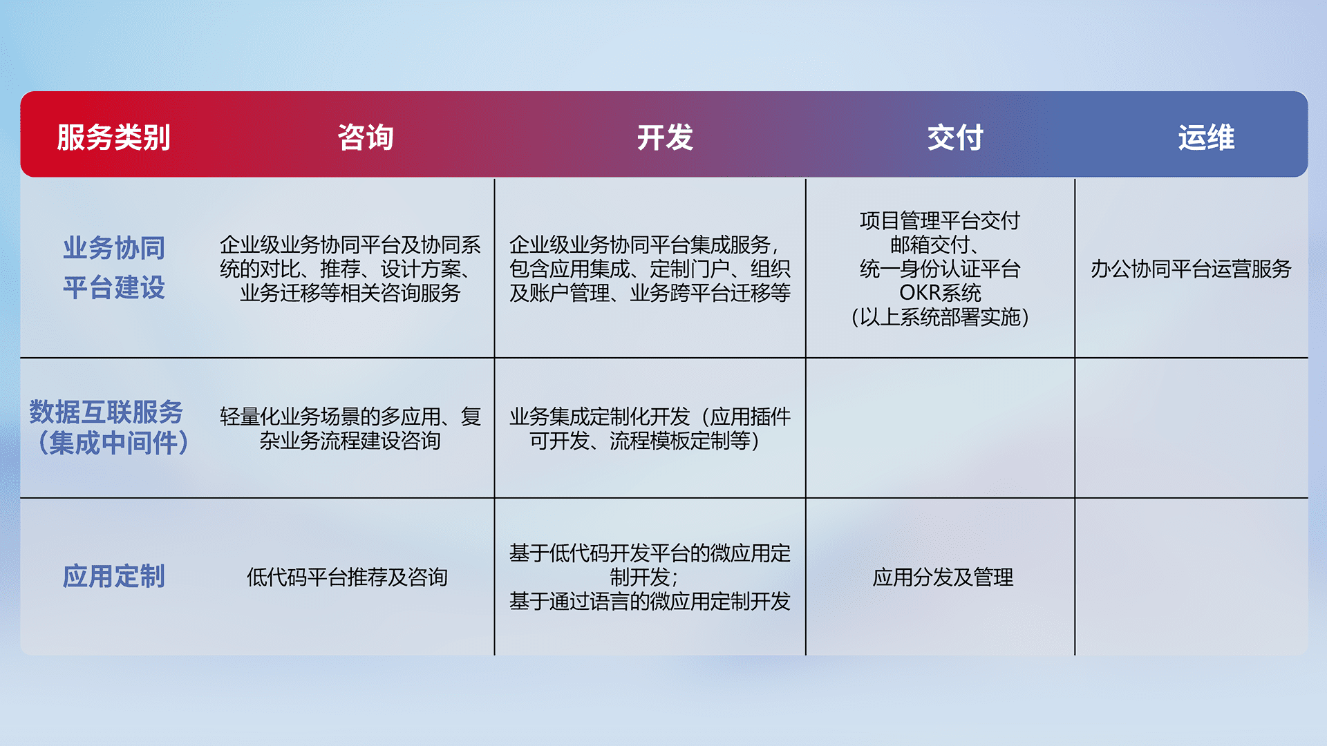 针对钉钉、、、、企微、、、、IDaas等平台级产品提供产品的规划、、方案、、、、交付、、、定制化开发等服务,,,,实现如统一协同办公、、智能客户服务、、、混合会议管理、、、、智能数据查询、、等业务场景,,,实现数字化转型。。。。