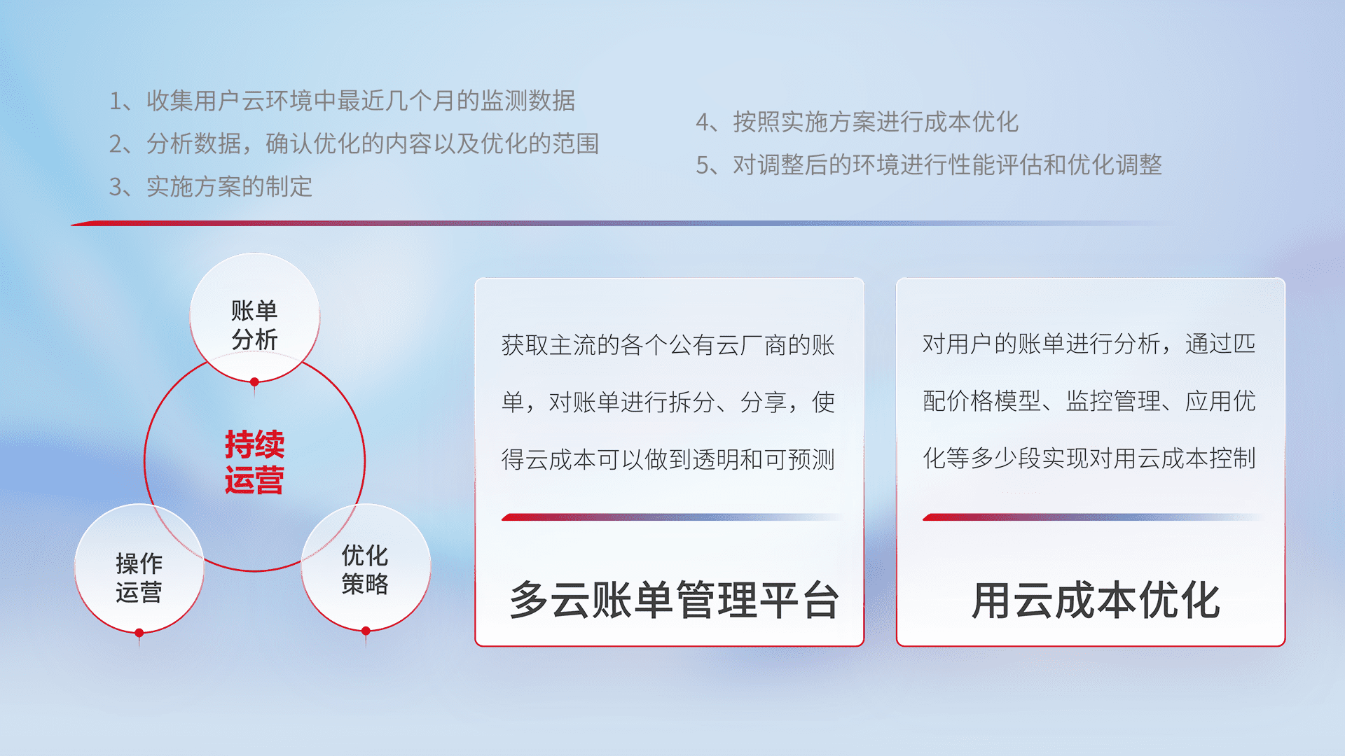 通过多云纳管,,,,以统一的资源数据模型把客户的云资源进行抽象和封装,,,,进而实现对多云资源的统一操作,,,保障云资源管理的可靠性、、、稳定性与可用性。。量身定制化运维内容,,,,配置、、开发运维、、补丁管理、、备份、、、监控、、、、认证和访问管理、、、、审计和日常巡检等,,,,保障在用云过程中的可靠度,,,稳定度以及高可用率。。。。
